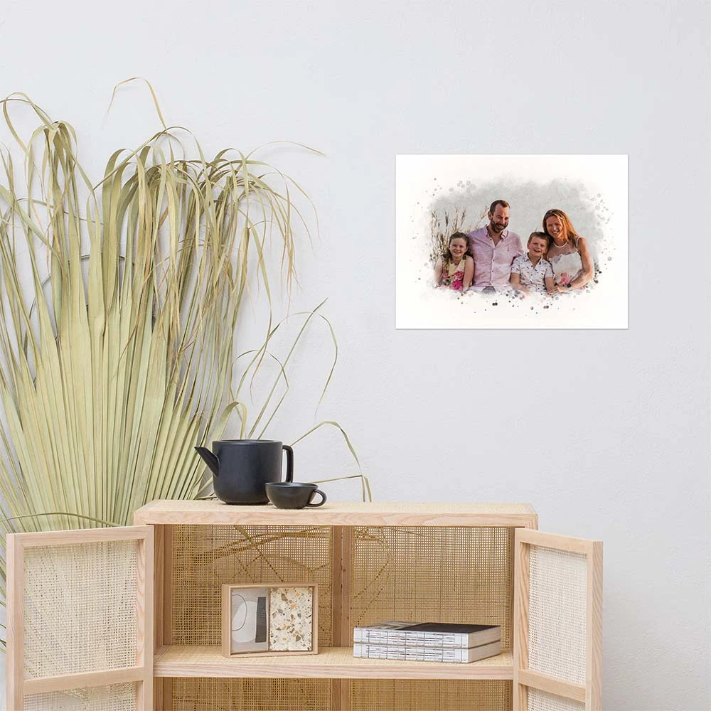 Custom Family Portrait Watercolor Fine Art transforms your family photo into a vibrant masterpiece, adding elegance to any space and making it the perfect gift for a loved one.