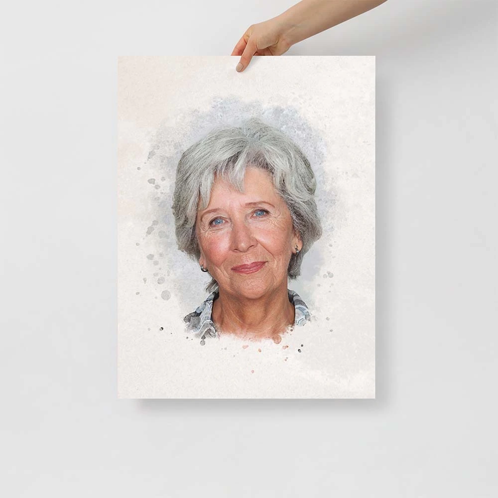 This personalized memorial portrait serves as a heartfelt tribute and adds a touch of elegance to any space. Printed on high-quality paper with advanced technology, your portrait remains stunning for years to come. The watercolor style brings depth and warmth, creating a poignant focal point in your home.