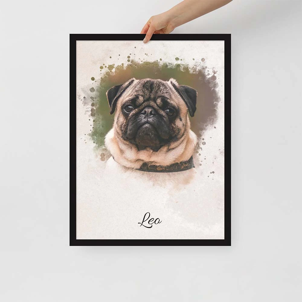Capture the loving expression of your beloved pet in a unique and personalized piece of art. Our Custom Pet Memorial Portrait Watercolor Framed Fine Art brings your pet’s personality and charm to life through soft brushstrokes and vibrant details. Each portrait is created from your photos, ensuring a truly unique representation of your cherished companion.
